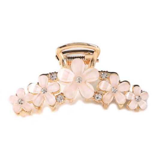 Die goldene Haarklammer mit Blumendekor aus funkelnden Schmucksteinen in zartem Weiß mit einem Hauch von rosé und glitzernden Kristallsteinen ist ein wunderbares Accessoire, das jede festliche Frisur zum Strahlen bringt. Sie verleiht der Trägerin einen Hauch von Eleganz und Anmut und lässt sie in einem bezaubernden Licht erstrahlen.