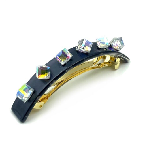 Entdecke mit der Haarspange „Twilight Elegance“ ein wahres Schmuckstück unserer neuen Kollektion im Haarschmuckparadies. Diese außergewöhnliche Haarspange in eleganter, gebogener Form misst 7,5 cm und besticht durch ihren faszinierenden Untergrund in changierendem Anthrazitgrau, der in tiefes Schwarz oder geheimnisvolles Dunkelviolett übergeht. Sechs funkelnde, quadratisch geschliffene Steine zieren dieses edle Accessoire und verleihen ihm eine glamouröse Ausstrahlung.