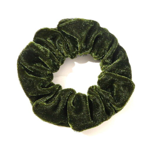 Unser Scrunchie aus olivgrünem Samt ist das ideale Accessoire, um deinen Look aufzupeppen. Mit diesem trendigen Haargummi bist du immer im Trend und verleihst deinen Frisuren einen stylishen Touch.