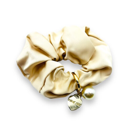 - Goldene Akzente und Perlenzauber: Die goldenen Perlen und die Herz-Applikation verleihen diesem Scrunchie eine unwiderstehliche Eleganz und einen Hauch von Luxus. Die Kombination von Beige, Gold und Perlen macht dieses Haargummi zu einem edlen Accessoire, das deine Frisur in einen Blickfang verwandelt.